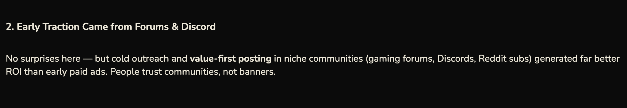 Native reach and high intent: in communities, fans invite fans. Also, people are more likely to produce user-generated content, have their in‑jokes, and eagerly share news, which power organic growth, often outperforming early paid ads for traction.