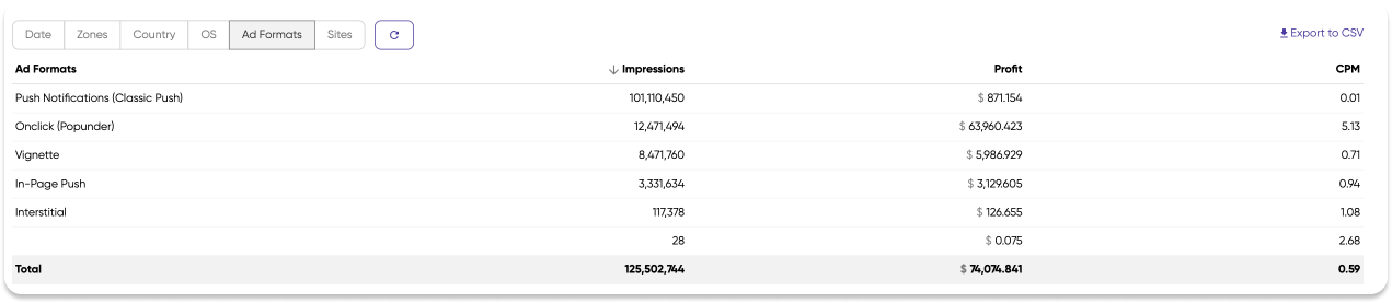 Push Notifications dominated in volume with over 101 million impressions, but their low $0.01 CPM resulted in just $871 profit. SmartLink (which reflected in the statistics as Onclick) was the clear leader, earning $63,960 at a $5.13 CPM. Vignette and In-Page Push added smaller but steady contributions, while Interstitial ads delivered the highest CPM of $1.08 despite limited impressions.