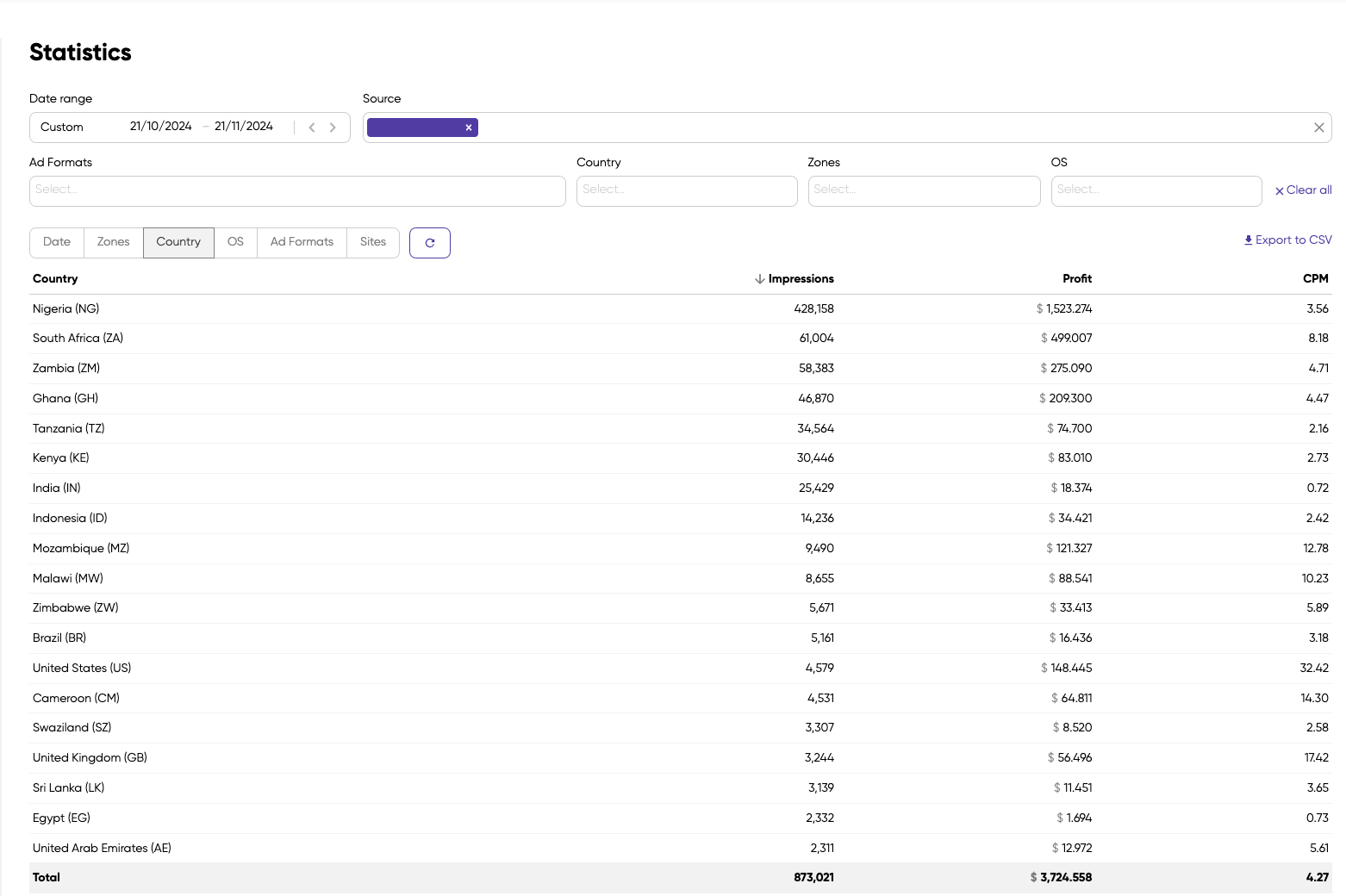 Here you can see daily impressions, profit, and CPM from November 1st, 2024, to November 21st.