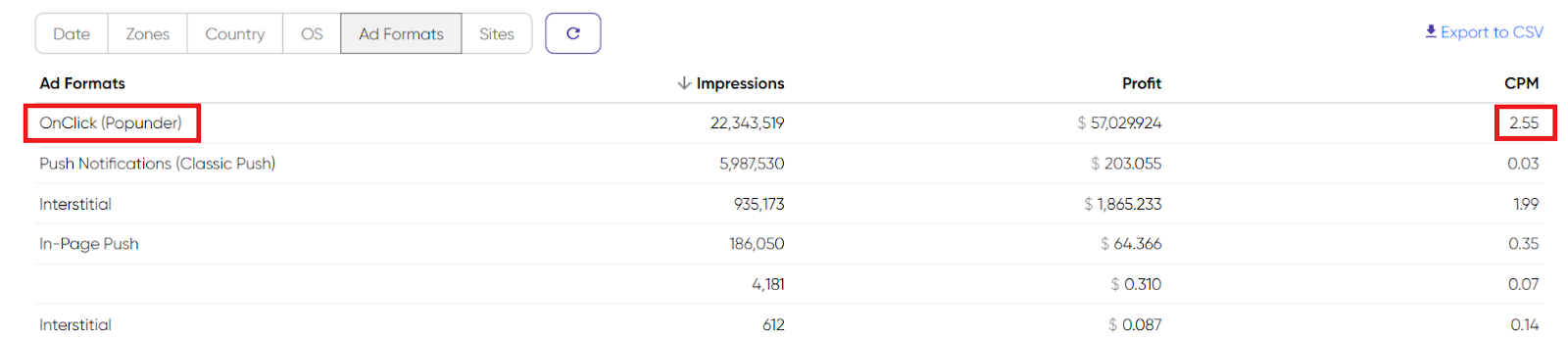 Our publisher tested most Monetag formats, and the choice was obvious: Onclick ads give him the highest CPM rates:
