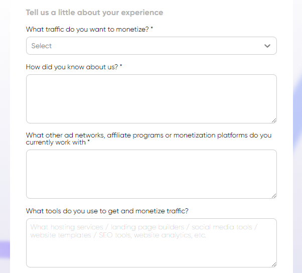 At Monetag, you just register, answer a range of very simple questions about your traffic, and grab the link to your account. Doesn’t take more than a couple of minutes before you can start earning, in fact.