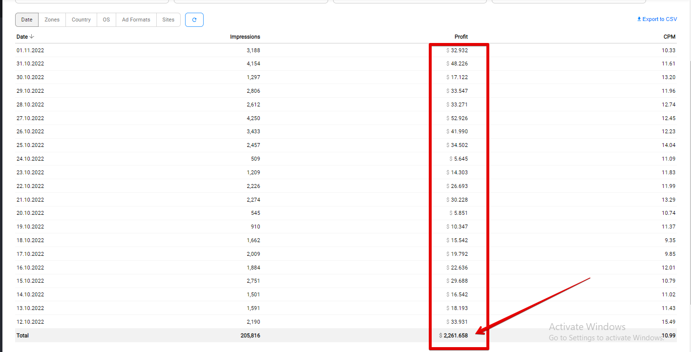 I made more than $2250 from September 1st to November 1st, plus you can see how many users I generated on a daily basis in the screenshot below.