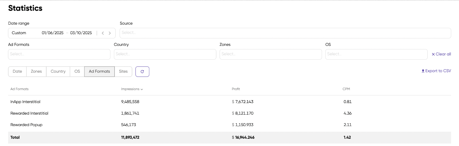 • Monetag In-App Interstitials: short full-screen ads that appear naturally between levels or during loading screens.