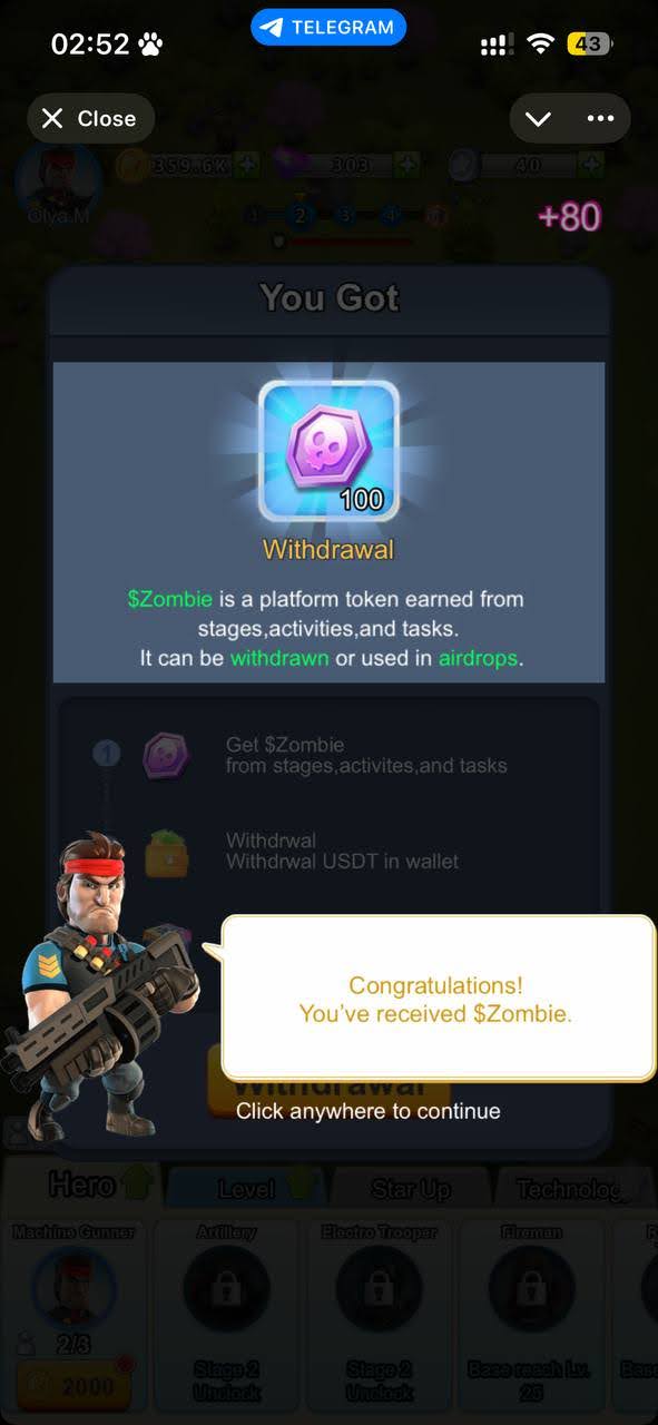 As most Telegram mini apps, it has specific earning mechanics: you earn in-game currency – $Zombie coins, get access to exclusive digital assets, and an airdrop pool.