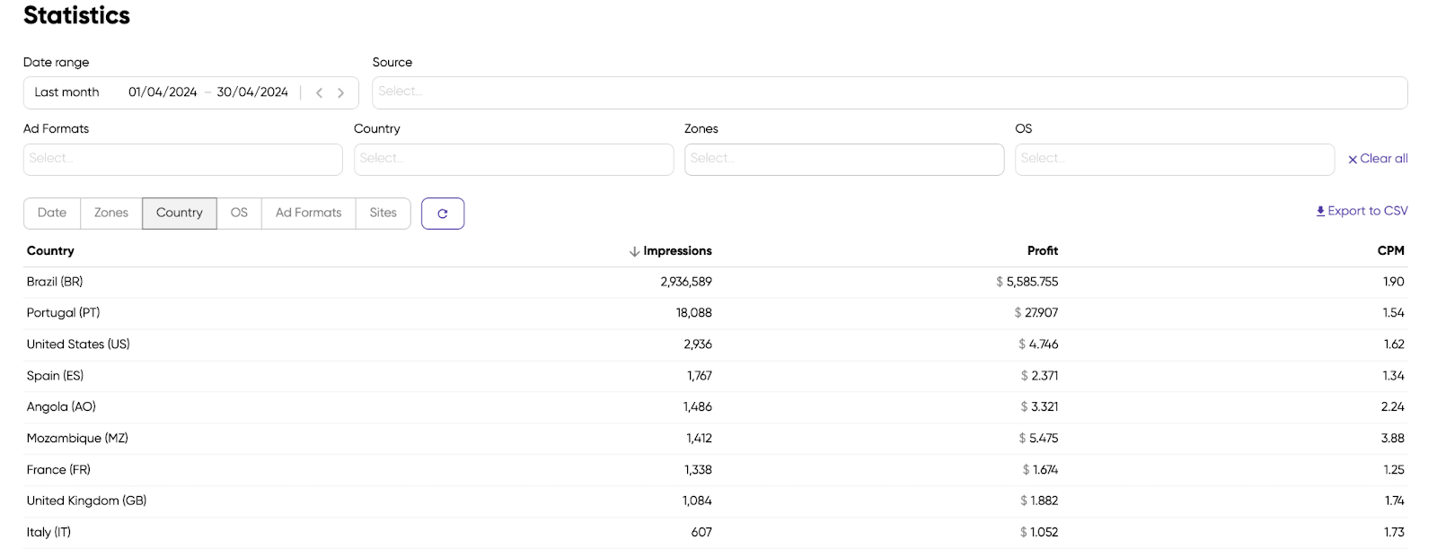 The sites mainly target Brazilian users, so the majority of impressions come from Brazil. However, the stats show that our partner also earns from a range of other GEOs, such as Portugal and even the United States, one of the most expensive sources.