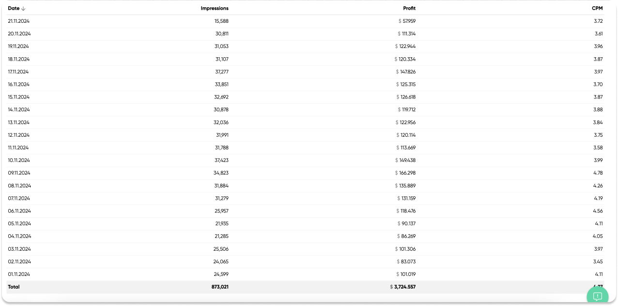 Here you can see daily impressions, profit, and CPM from November 1st, 2024, to November 21st.