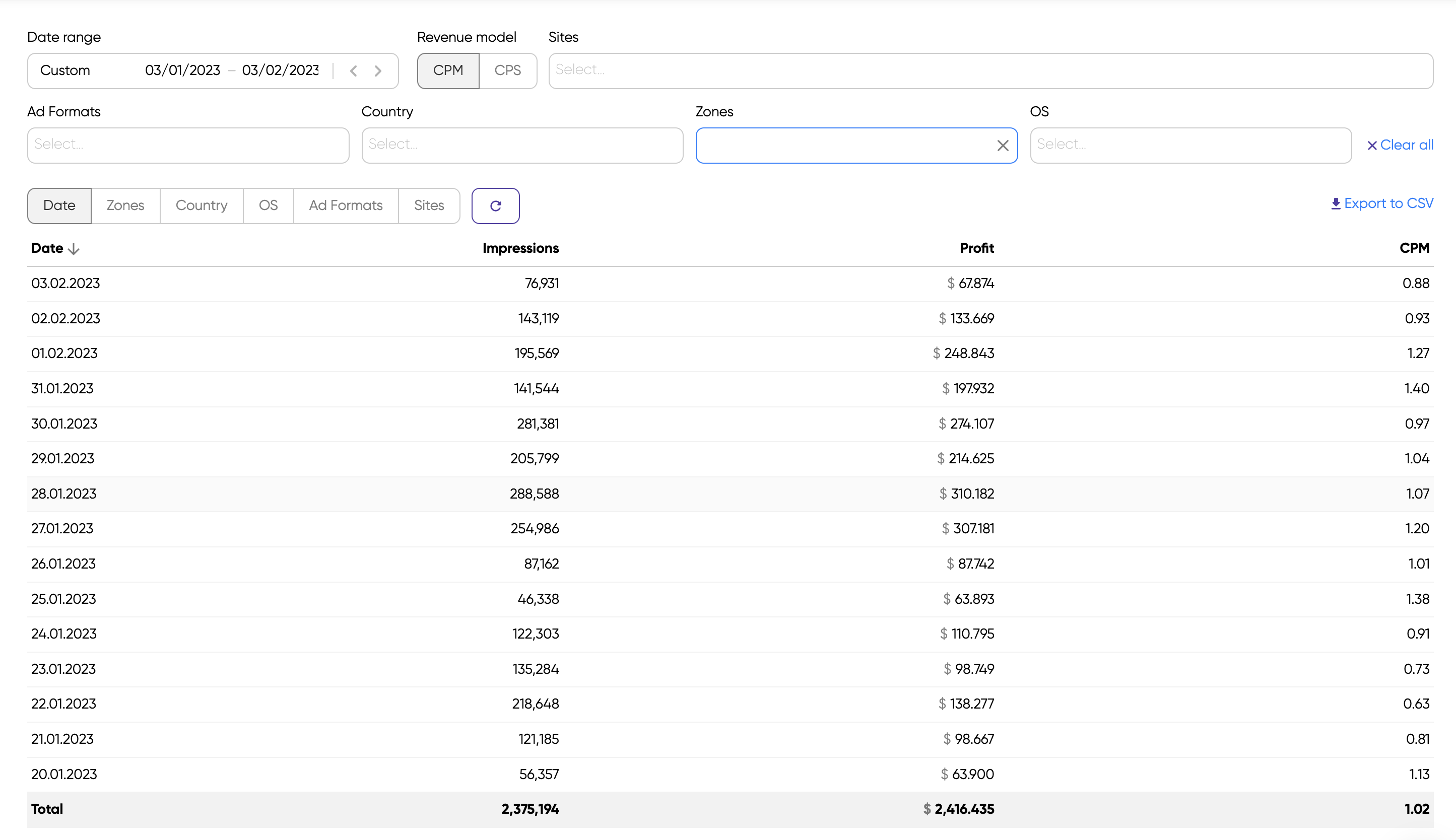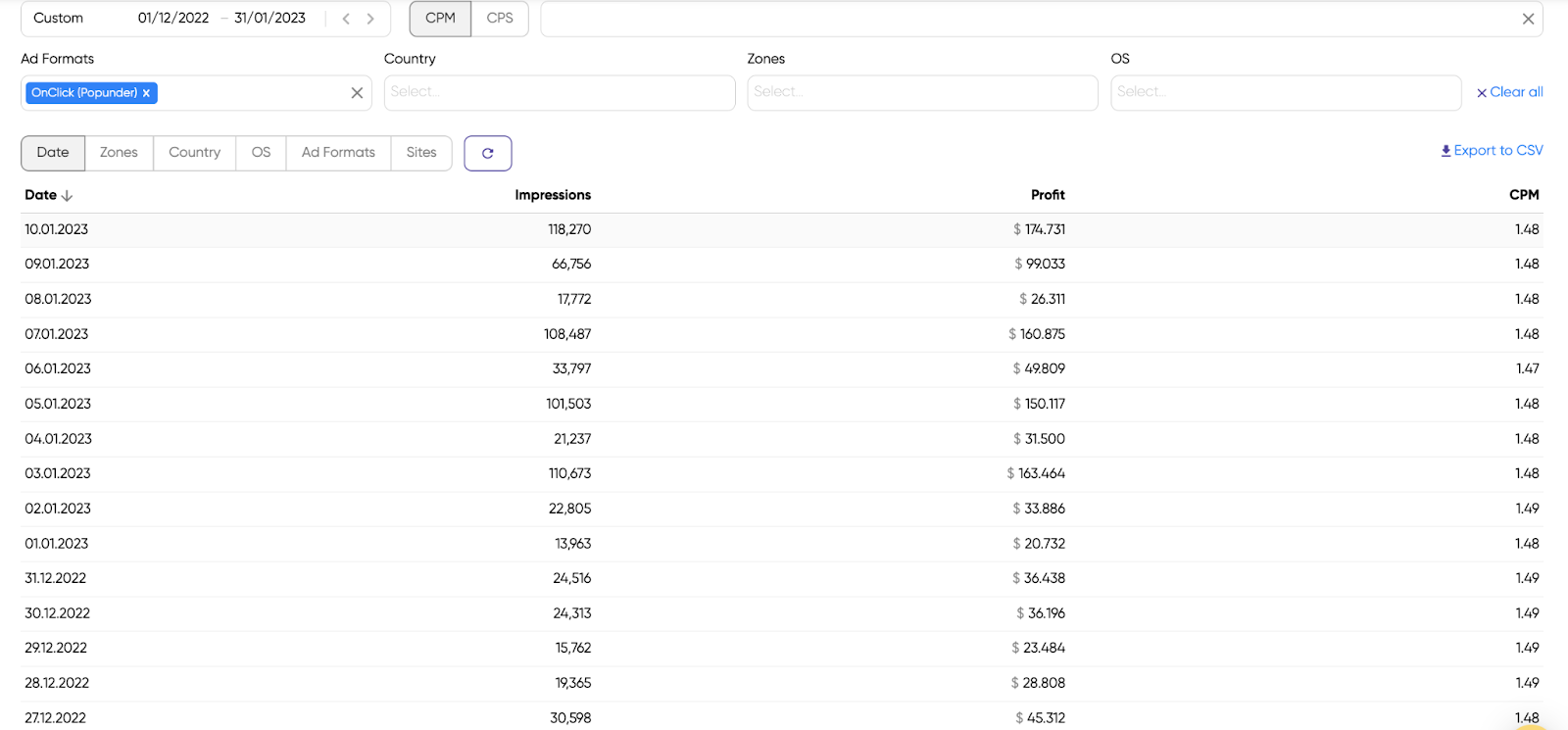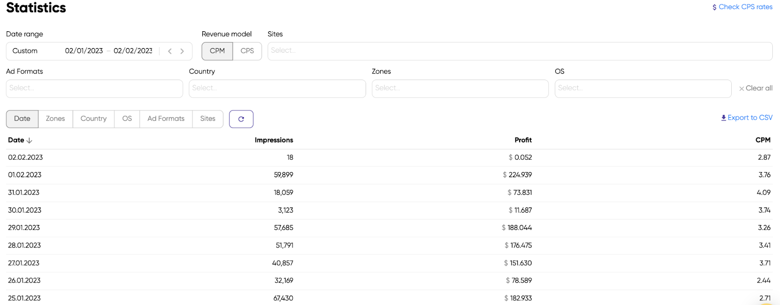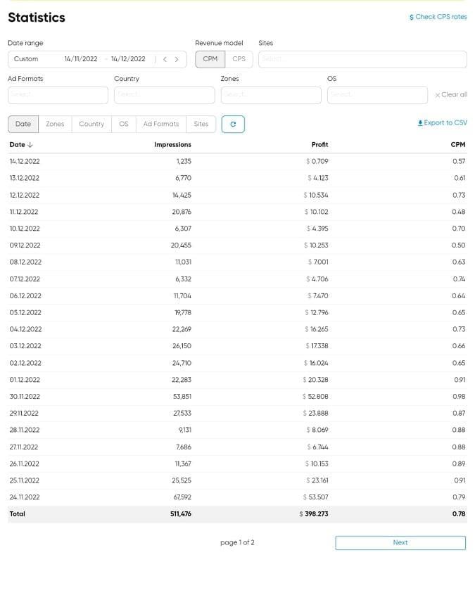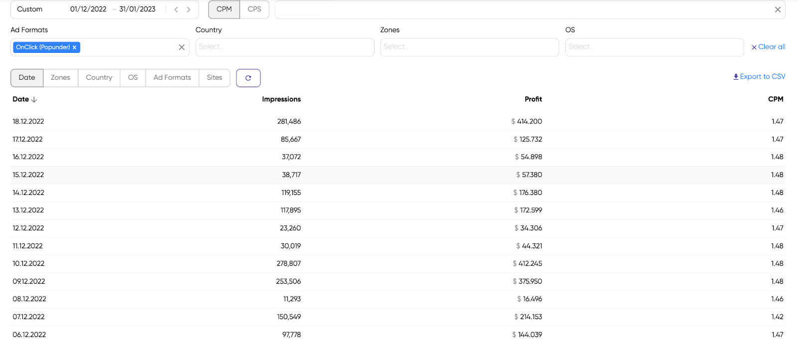 OnClick is the king format for a sports site — but checking the other formats or activating MultiTag is also worth trying. And don’t forget about Direct Link, which is almost universal for most websites — here is an example of Direct Link stats of another cricket publisher: