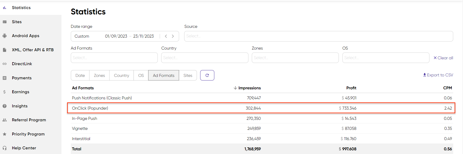 Bear in mind: In our internal charts, SmartLink data is presented as OnClick (Popunder), because both of these formats open landing pages.