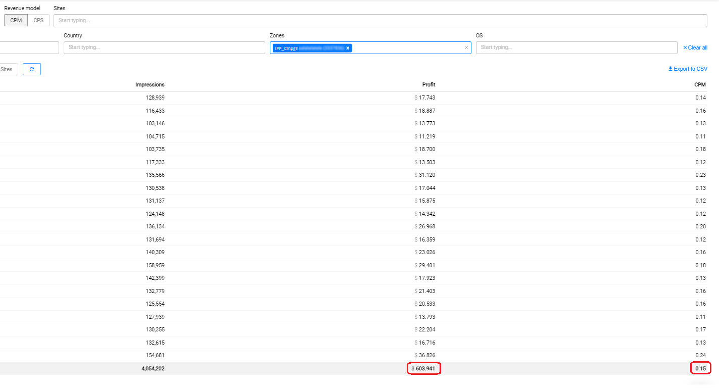 They made $603.94 in profit, with a $20 daily average. The average CPM for IPP was $0.15, fluctuating between $0.11 and $0.24.
