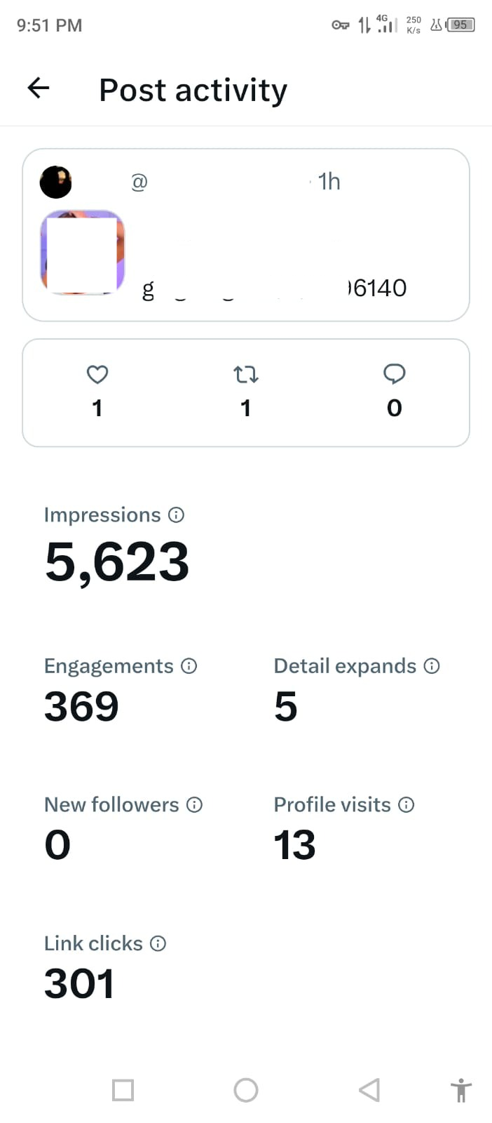 This tweet collected a whopping 5,623 impressions in an hour and resulted in 301 link clicks. Although there is only one like and repost, the tweet stayed visible to the audience in the recommendations feed.